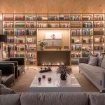 Un mur complet d’étagères avec éclairage caché est une idée lumineuse pour ce salon