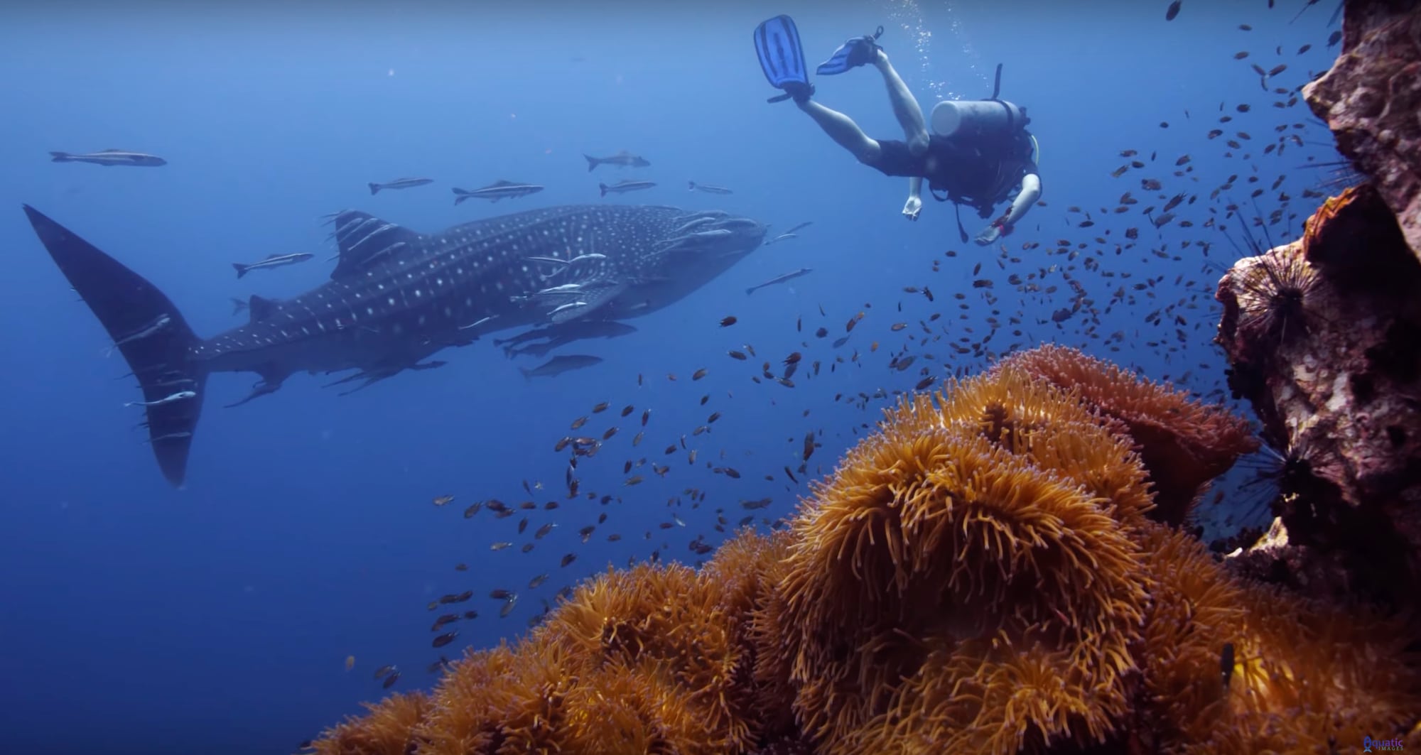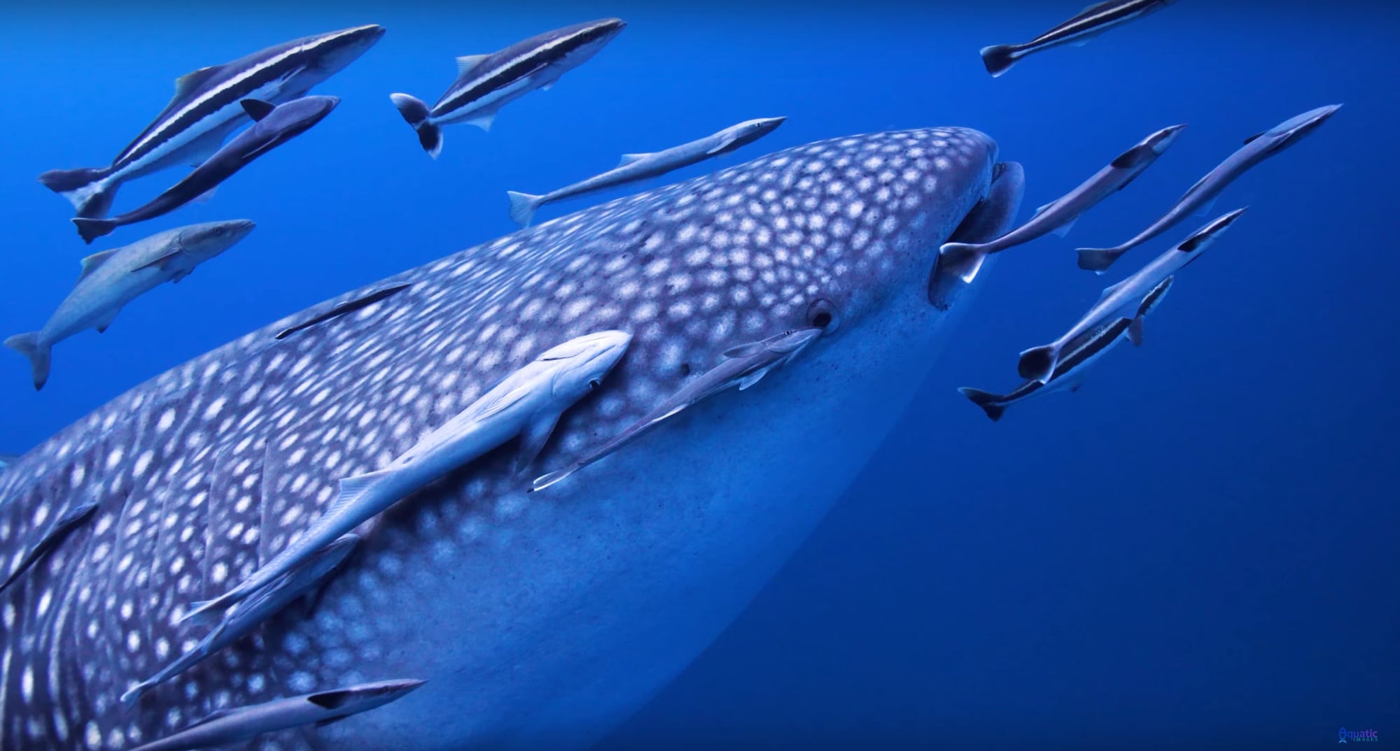 Des images sous-marines d’une plongée au large de KoTao s’ouvrent sur le corps tacheté d’un requin baleine. Documenté par une petite équipe de Images aquatiques lors de deux excursions, la créature géante et lente est montrée glissant gracieusement à travers le golfe de Thaïlande avec ce qui semble être des dizaines de remora, ou ventouses, qui accompagnent le trajet – ces petits nageurs ont tendance à nettoyer les bactéries et les parasites de leur hôte en échange de nourriture et de déplacements faciles.