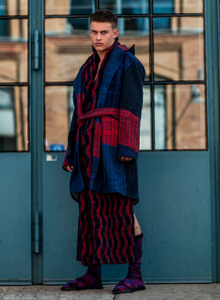 Le créateur de tricots basé à Berlin crée des silhouettes étonnantes en expérimentant avec des structures et des fils. La qualité visuelle et surtout tactique de la surface est étonnante. La collection et ses silhouettes sont non seulement intemporelles mais aussi sans genre, car le travail de Sidjimovski n’a pas d’identité fixe. Les textiles et ses couleurs profondes donnent une atmosphère luxueuse et parfois même une ambiance rétro à travers ses contours.