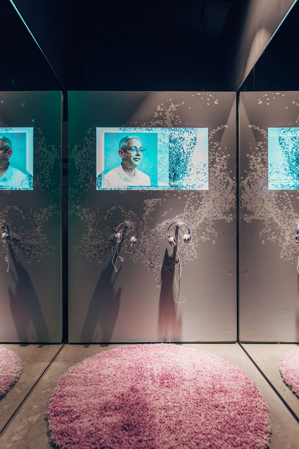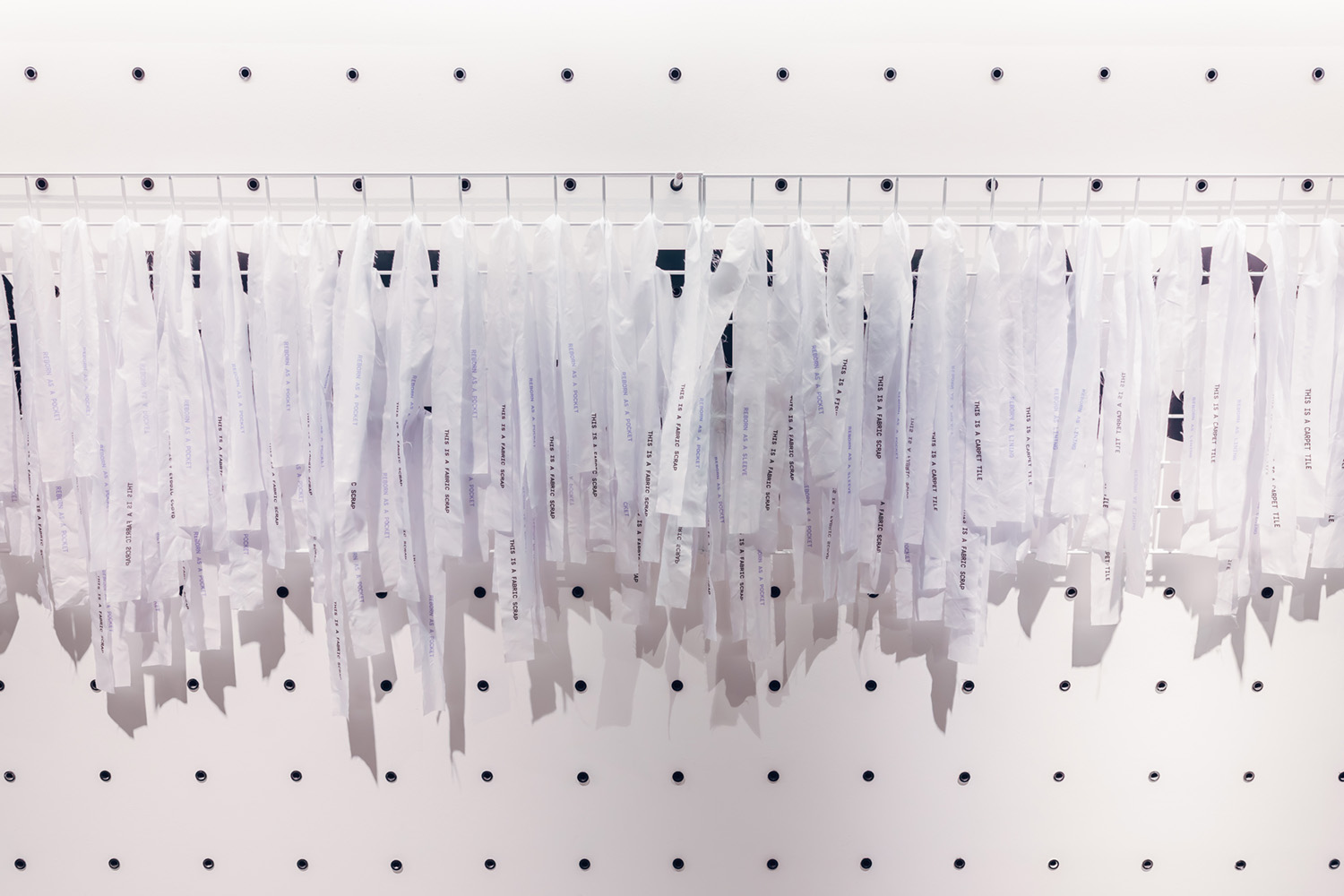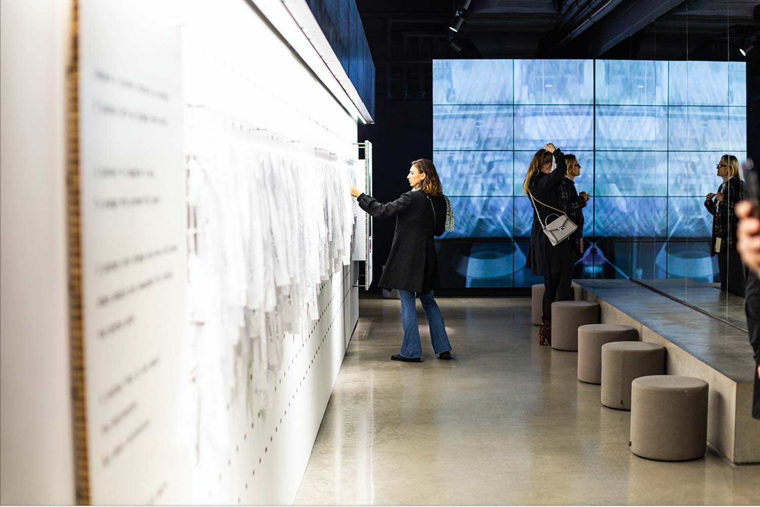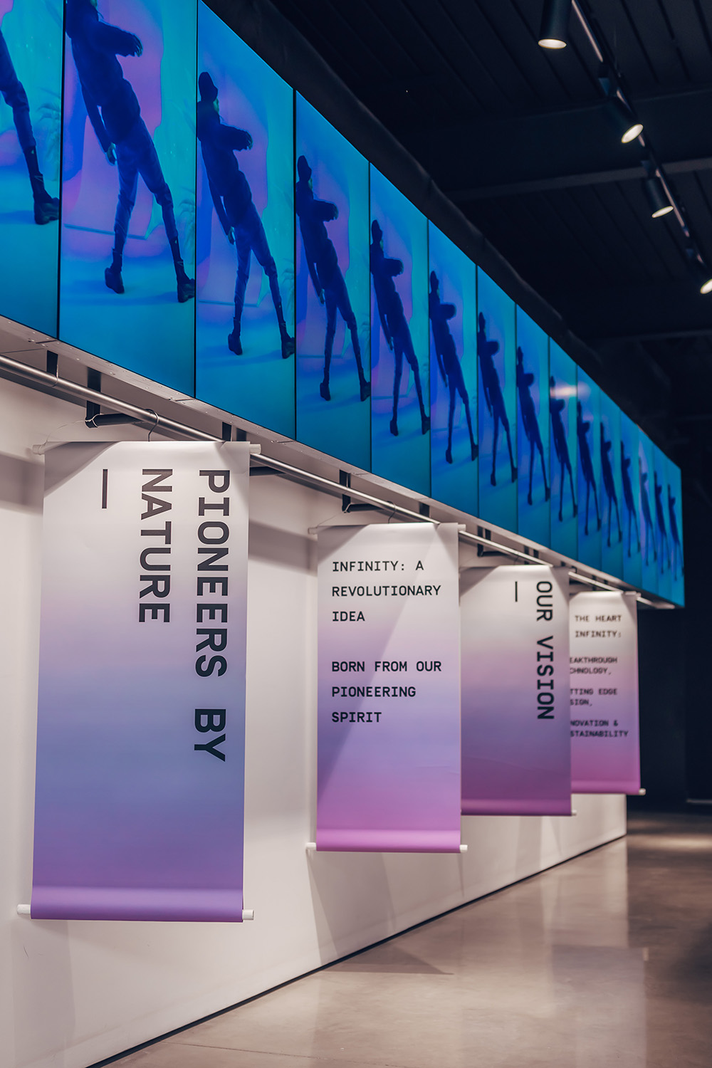 Les bandes suspendues d’Econyl® (nylon régénéré) ont formé une vaste installation de narration interactive encourageant les utilisateurs à toucher le matériau et à découvrir le processus de fabrication derrière Infinity.