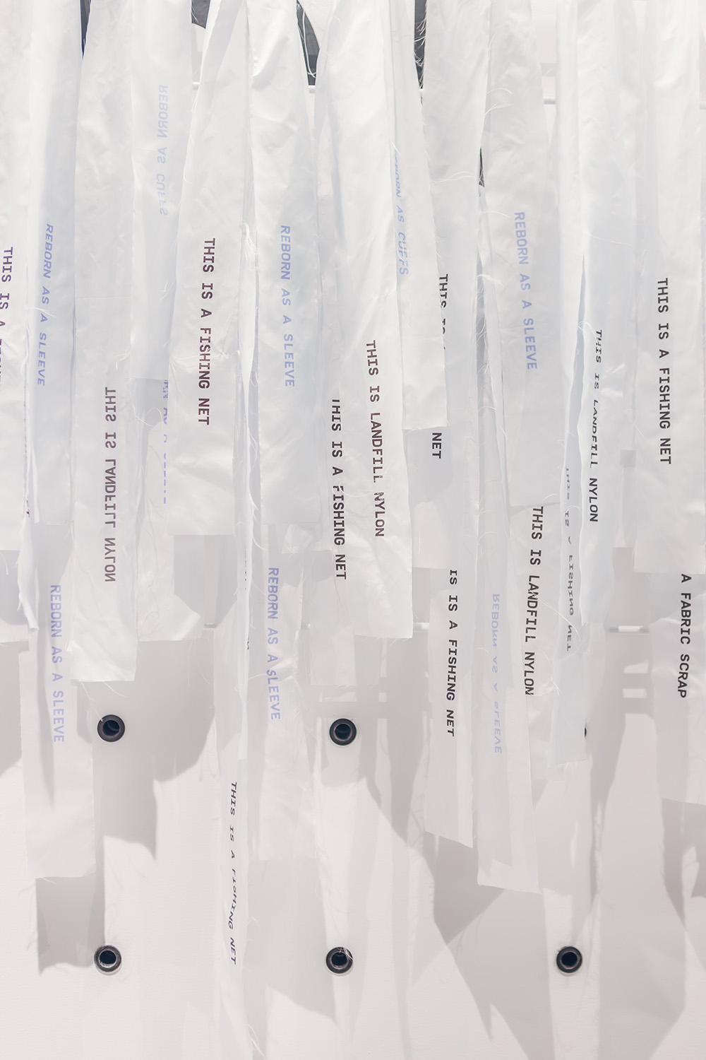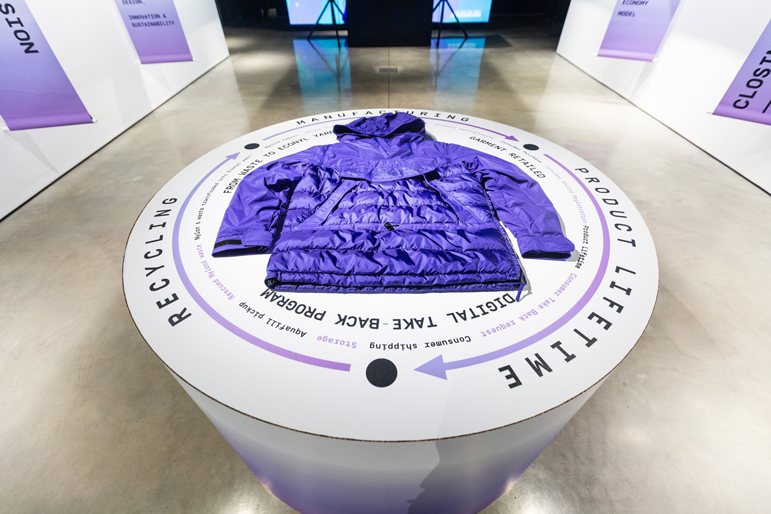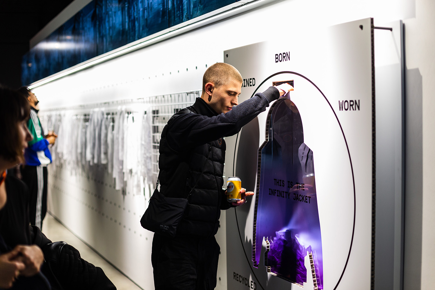 Les histoires d’utilisation passée, y compris les restes de tissu, les filets de pêche et les dalles de tapis, ont simultanément invité les visiteurs à placer les bandes de nylon recyclé dans un dépôt en forme de veste Infinity, révélant le message de campagne intégral – Recyclé. Repensé. Reborn, au fil de l’événement.
