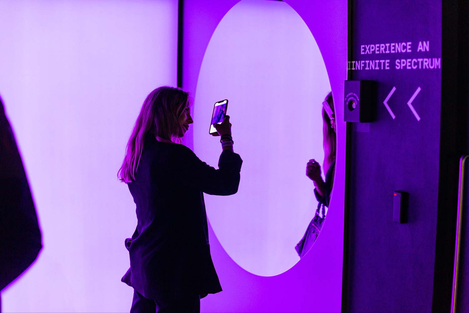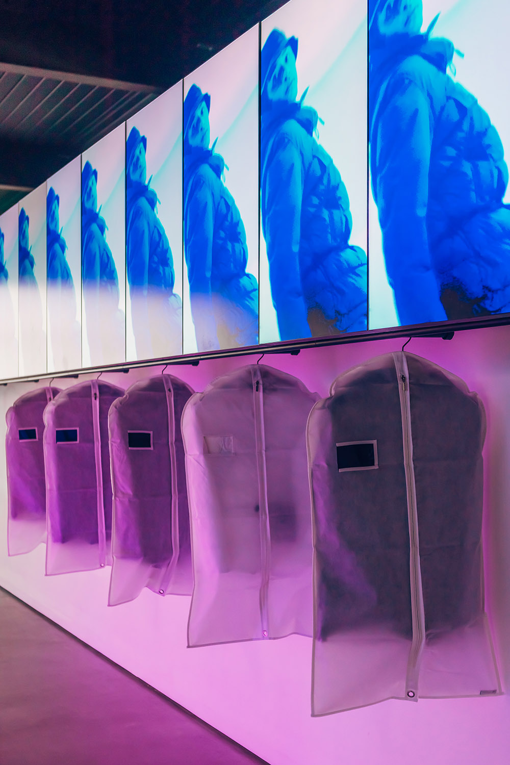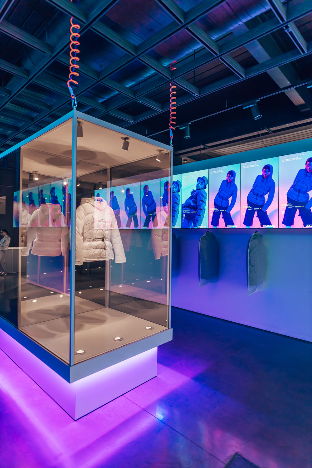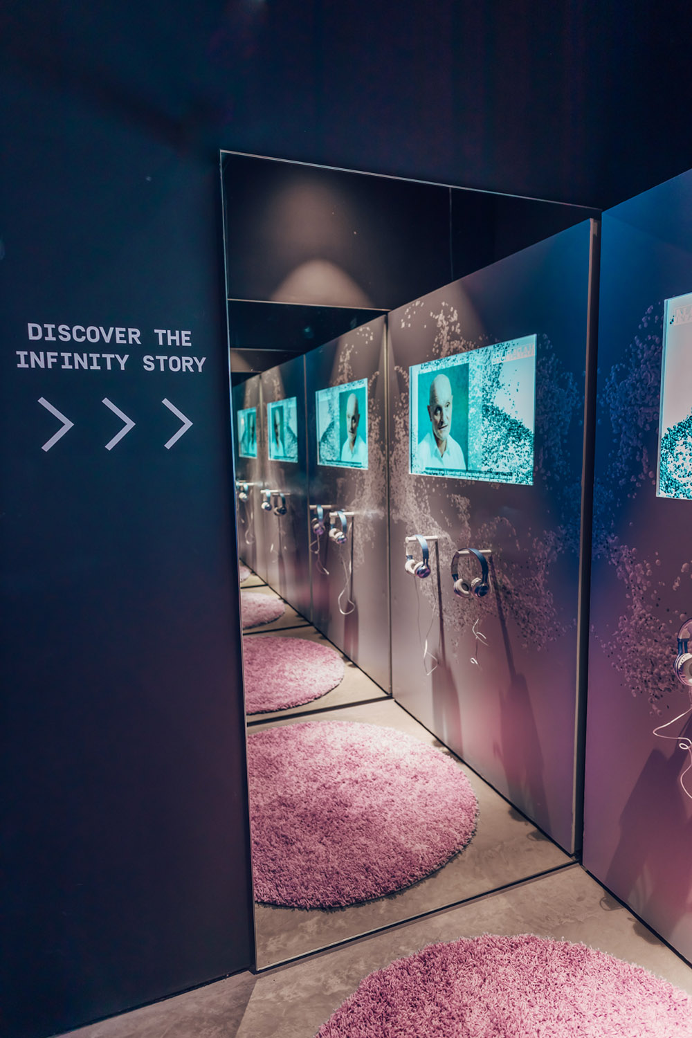 Le voyage à l’infini a culminé dans le hall central où la veste Infinity a occupé le devant de la scène. Entouré de vidéos de campagne engageantes, Infinity était enfermé dans un grand réservoir en verre à miroir à deux voies au cœur de 18montrose, dramatiquement caché et révélé avec un éclairage spot séquentiel et intégré – un moment révélateur fascinant lors de l’événement de lancement, où les visiteurs ont pris un premier aperçu exclusif du produit devant le grand public.