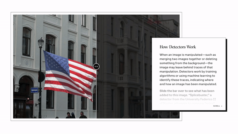 L’assembleur fonctionne en combinant plusieurs «détecteurs de manipulation» en un seul outil. Chaque détecteur individuel – certains flambant neufs et créés par Jigsaw, certains créés par des universitaires de diverses universités—Est conçu pour repérer un autre type de manipulation d’image; ensemble, ils peuvent donner aux journalistes «une évaluation complète» de la question de savoir si une photographie a été falsifiée ou non.